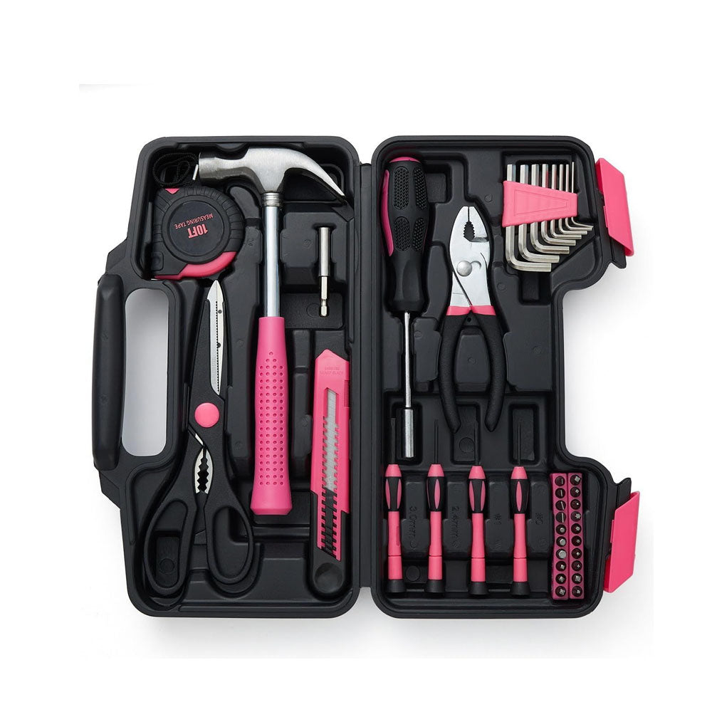 Descubre nuestro maletín de herramientas básicas rosas, un conjunto encantador y funcional que incluye 39 piezas esenciales para cualquier proyecto. Este kit no solo es atractivo por su color vibrante, sino que también está diseñado para ofrecerte la máxima durabilidad y resistencia. Cada herramienta está fabricada con acero al carbono 45C o acero al cromo vanadio, garantizando calidad y rendimiento.